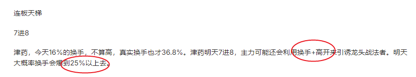 昨天不想说,今天不用说,我估计今天大部分兄弟的盈利都超过我。除了去买龙头津药的人。昨天晚上复盘说道:“津药,今天16%的换手,不算高,真实换手也才36.8%。津药明天7进8,主力可能还会利用换手+高开来引诱龙头战法者。明天大概率换手会爆到25%以上去”。这就是对个股量价的理解,龙头战法并不是数板战法,今天又有多少人被这个高开诱骗进去了呢?