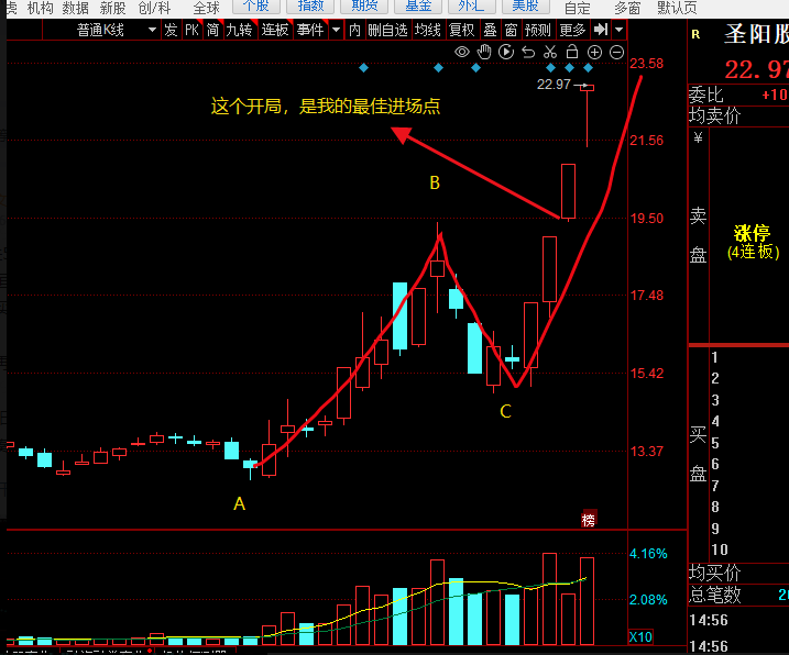 3B的快速拉板+4B的大幅高开,这就是明显的主力控盘手法。有人这次在4板追进去吃肉了,这是概率性的吃肉。它晋级4板的时候,上方正好没有了高标,它自身成为了高标,这是它能晋级4板的重要原因之一。