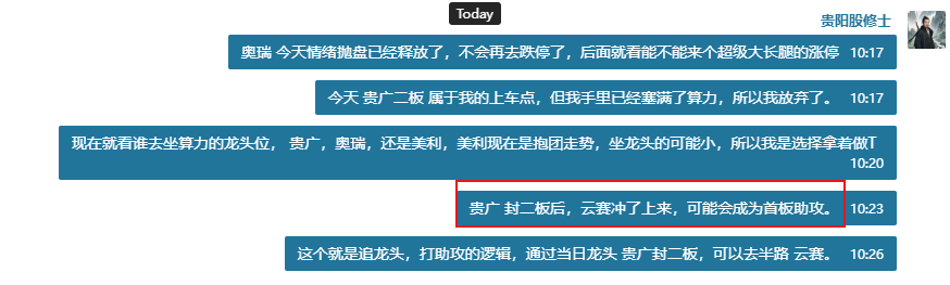 我说道:贵广封二板,云赛冲了上来,可能会成为首板助攻。次日如果半路上车,也可先吃3个点,不过我还是没上。
